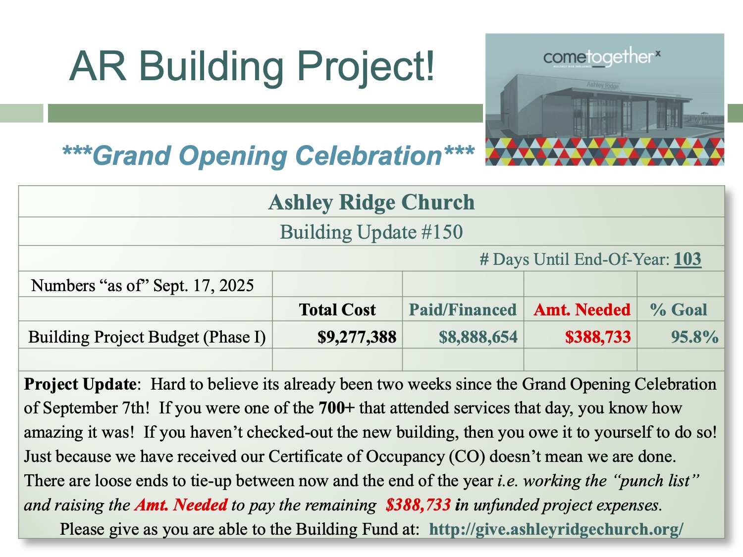 Project Update: We are in “The FINAL COUNTDOWN” to a Grand Opening & to a Completely “paid for” and/or financed Building Project (Phase I). With just 17 Days until the Grand Opening, we need your help in paying-off the above Amt. Needed of $407,630 Can you help? Ashley Ridge has made good progress since my last report of knocking-off another $51,094 from the remaining unfunded project expenses!